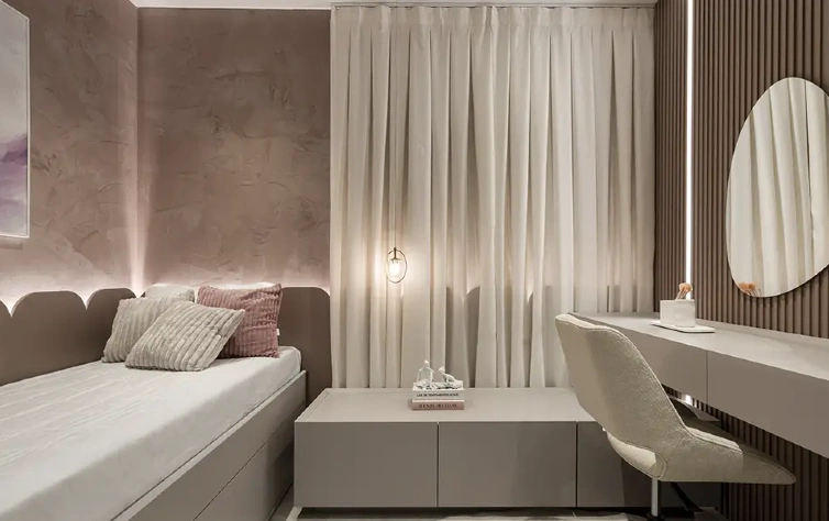 - O uso de cores próximas entre revestimento e armários contribui para a unidade visual e amplia a percepção de espaço, especialmente em quartos pequenos e planejados.